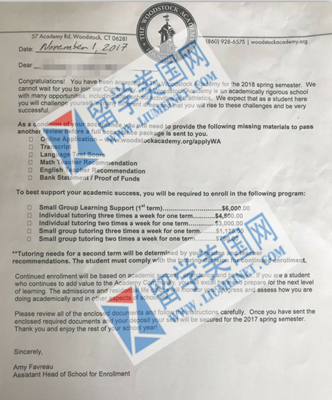 恭喜Z同学成功获得Woodstock Academy录取offer!Z同学非常优秀,获得了招生官和校长的青睐,当场拿到了录取!Z同学这个case很紧急,申请Woodstock Academy面试时间也非常紧迫,文案团队连夜加班给Z同学做面试培训,并在推荐信和文书方面下了很多功夫,Z同学非常优秀,在钢琴方面有特长,当场给招生官和校长演奏了一曲肖邦,赢得了现场所有人员的赞誉,最终Z同学获得了录取!感谢留美网全体团队的努力和付出!把学生的事情放在第一位!把学生的未来放在第一位!在这里也祝愿Z同学在美国展翅高飞!前程似锦!想申请的同学可以马上咨询:400-000-7805,010-65183908,微信:liumeinet2014