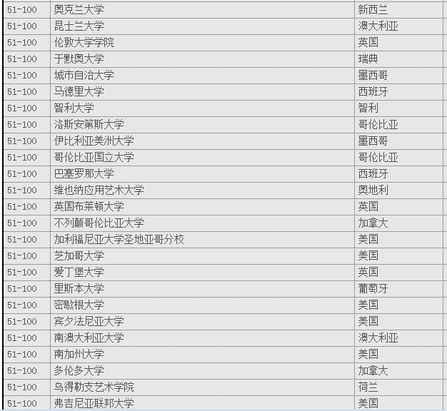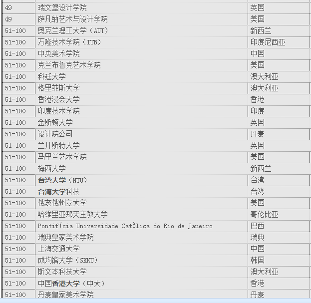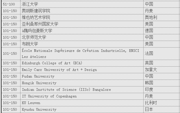 世界艺术设计院校排名前100