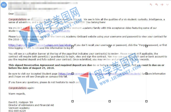 恭喜吕同学获得 Vermont Academy 福蒙特中学 录取offer