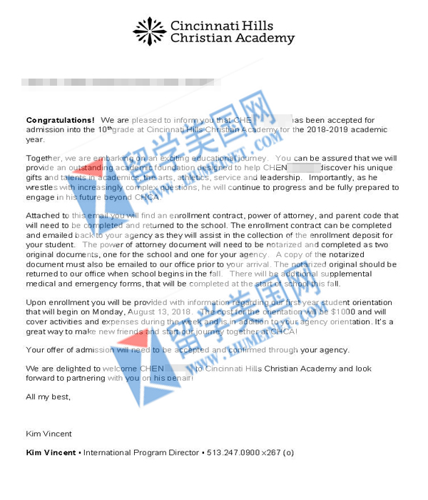 恭喜留美网同学补录辛辛那提山学校 Cincinnati Hill Christian Academy