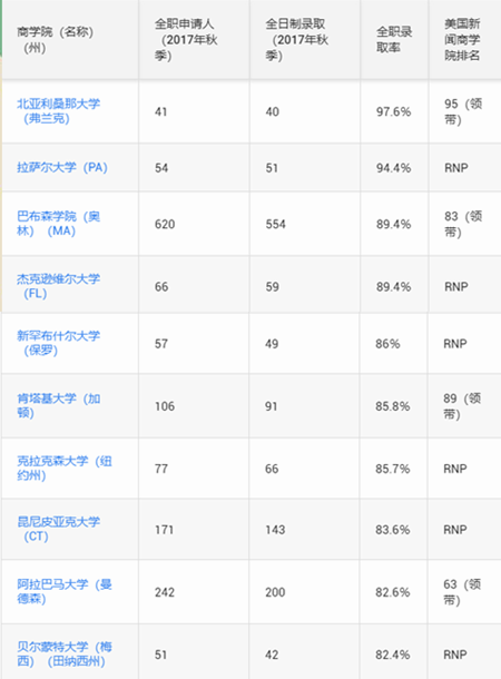 根据统计数据显示,2017年秋季接受率最高的10所研究生商学院中,超过80%的全日制MBA申请者被接受。