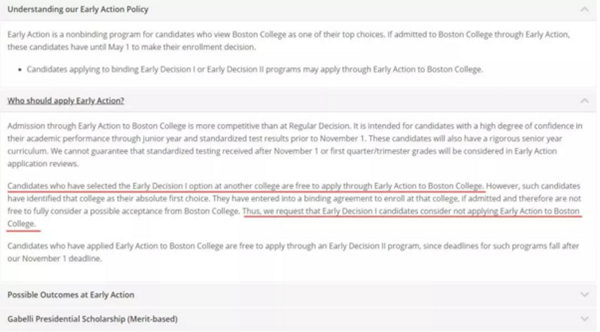 波士顿学院官网上最后又特别强调:强烈请求各位申请其他学校ED1的申请者不要申请波士顿学院的EA。但是从整体政策的规定上讲,EA不属于限制性申请,所以申请其他ED可以同时申请波士顿学院的EA。