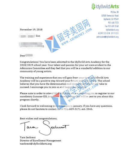 (艾迪怀德艺术高中Idyllwild Arts Academy录取信展示)