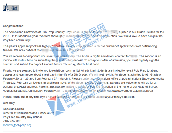 入读学校:波利预科走读学校Poly Prep Country Day School