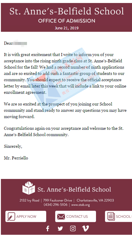 恭喜Z同学收获圣安妮贝尔菲德中学(St.Anne’s Belfield School)Offer
