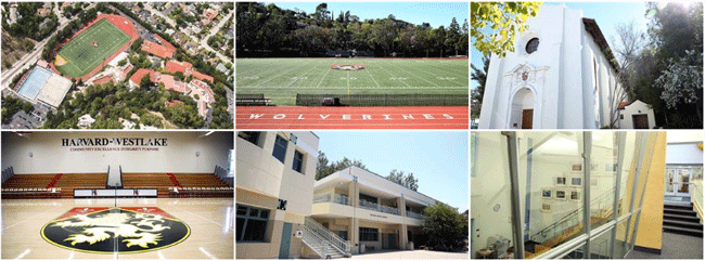 Harvard-Westlake School有两个校区,Holmby Hills的中学校区和Studio City的高中校区。每个校区都有学术,视觉艺术,表演艺术空间,运动场和健身房。全校大约有1600名学生,其中10-12年级有870名,7-9年级有730名,有色人种占学校40%左右。