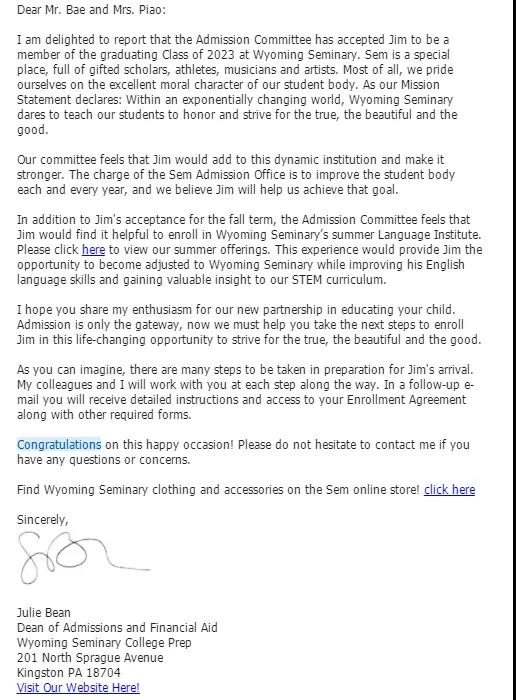 恭喜留美网裴同学斩获怀俄明学院的offer!这样的好消息对于现在处于迷茫的各位家长和学生们来说都非常的重要,疫情不会影响孩子的申学,各位家长朋友们要放松心态,提前规划和申请,有问题咨询顾问老师:liumeinet2014。
