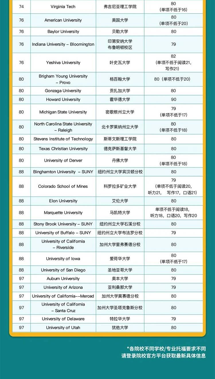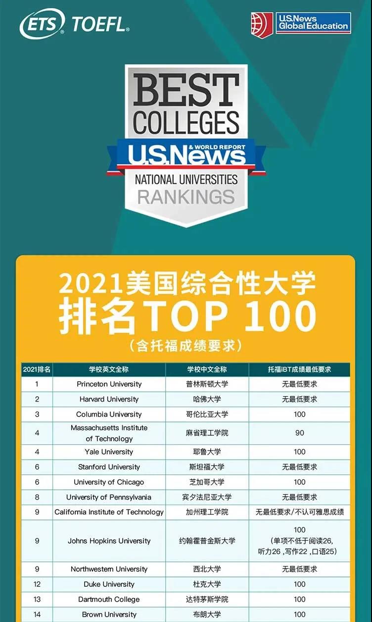 最新 | 美国TOP100大学最低托福成绩要求发布!建议收藏!
