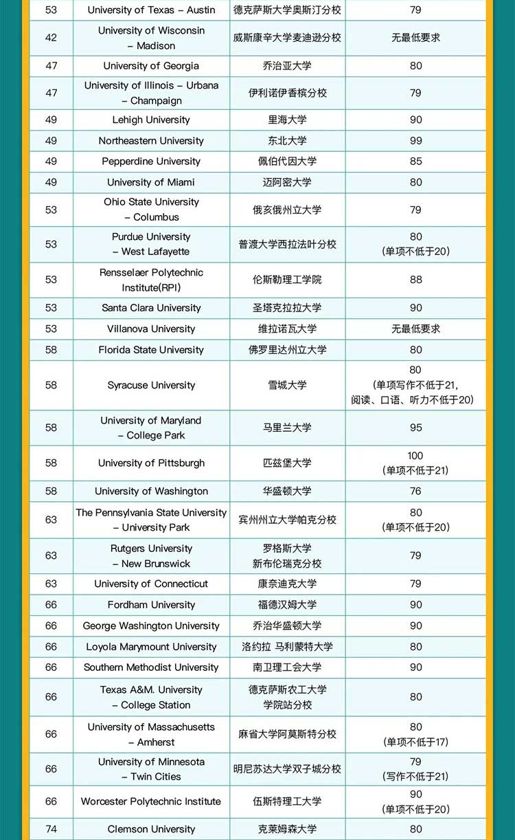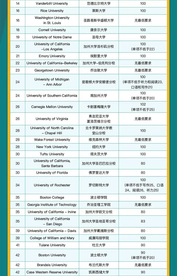 看了以上的要求想必大家心里也已经很清楚每个学校的要求,但是如果想要申请顶尖的学校托福至少要到100+更具竞争力,而以上的要求也只能作为参考,在实际录取的学生成绩中托福均分都会再高一些。
