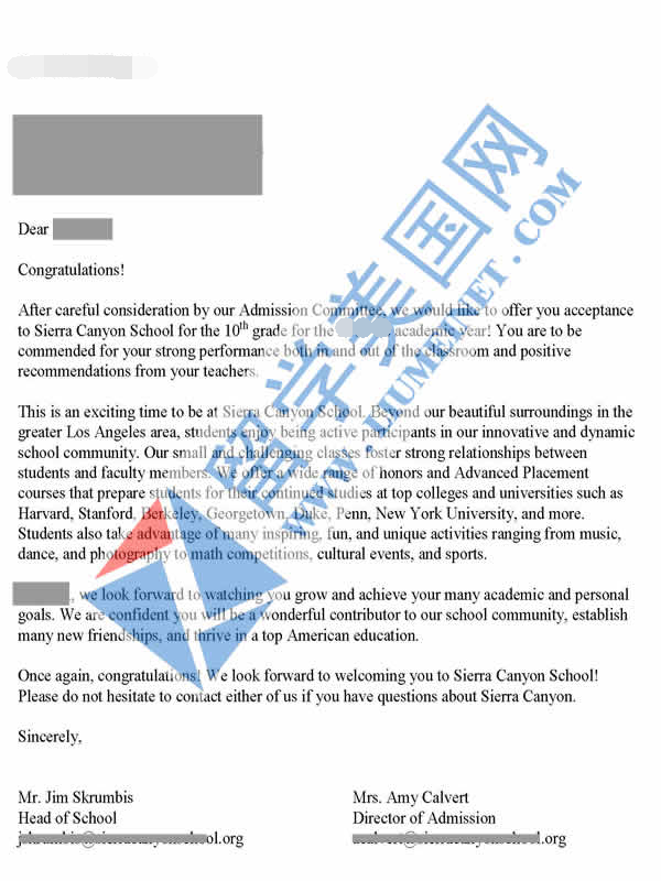 留美网X同学被塞拉峡谷高中 Sierra Canyon School录取Offer展示
