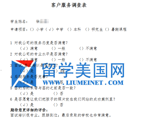 X同学就读上海的一所国际学校,成绩很优秀,但是当时决定申请时没有任何标化成绩。家长对美国学校要求很高的,目标学校都是顶尖学校。针对这种情况,我们抓住校方来国内这个机会,让学生从上海赶到北京来参加现场面试会。同时,由于我们团队工作认真负责,抓住学生的申请的优势和亮点,又积极的对学生进行面试培训,耐心的指导。我们团队以最快的速度,用一天的时间,高效率地将学生的申请材料及时递交给学校,使学校的面试官和招生官在第一时间内看到学生的材料。面试完每二天学校就发来了录取,高效、负责和诚信,一直是我们的理念,真心祝福X同学未来学习之路开心快乐!