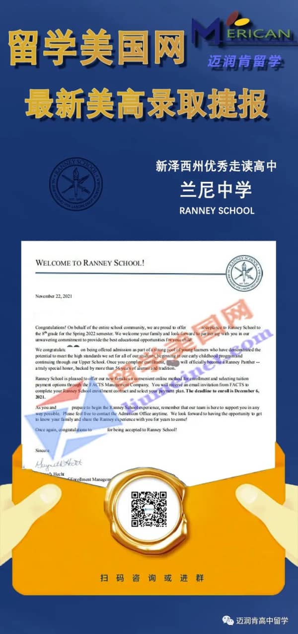 祝贺留美网H同学成功收获Ranney School录取