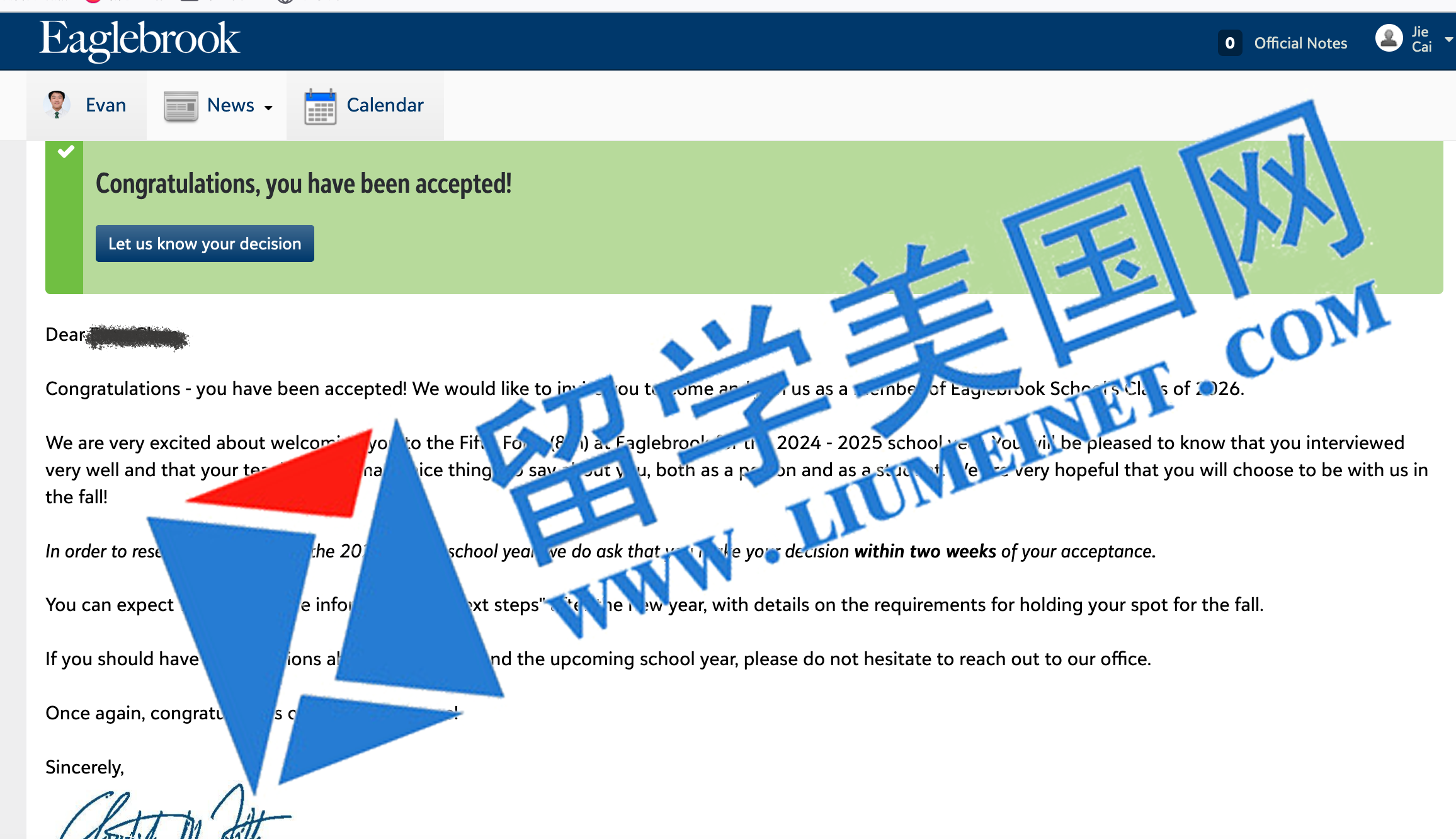 恭喜留美网学子Z同学斩获鹰溪中学 Eaglebrook School录取offer