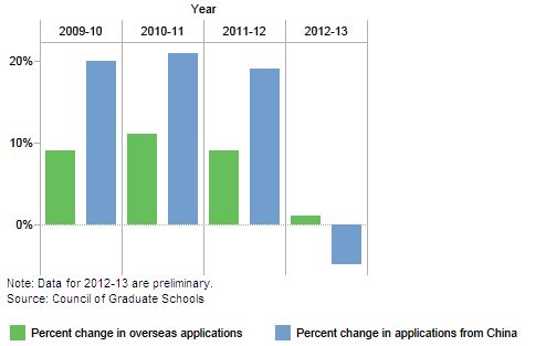 2013年中国学生申请来美读研人数呈负增长(图片来源:美国研究生院委员会)