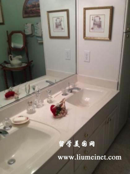 不用我说,您也看出来了吧。洗漱间,墙面上一面明亮的大镜子,两个洗漱池,绝对够用啊。