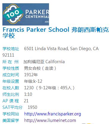 弗朗西斯帕克学校成立于1912年,是圣地亚哥历史最悠久、规模最大、男女合校的私立走读学校,从幼儿园到12年级,共有学生1230人。从建校伊始,学校是南加州中小学教育界的佼佼者。作为二十世纪早起先进教育的典范,弗朗西斯帕克学校至今坚持为圣地亚哥的年轻人提供优质的大学学前教育。无论是在学术方面、艺术方面还是体育方面,我们学校都在全国享有盛誉。