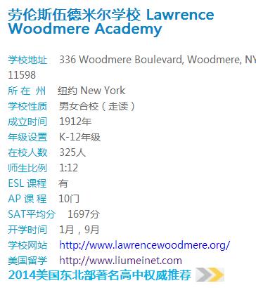 【推荐理由】劳伦斯伍德米尔中学,学校属于纽约蓝带高中,师生比只有1:5,属于小型学校,学生总数325,其中国际生有23人。小型学校对学生关注度比较高。孩子较小,需要较多关注度的孩子比较适合考虑。