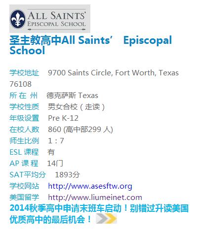 圣主教高中All Saints’ Episcopal School于1951年在沃斯堡市圣主教教堂成立,最初是一所学前幼儿园,现在学校开设Prek-12年级,校园坐落于沃斯堡市西区,颇有大学学院风格。圣公会教堂在18世纪晚期由英国国教建立,被公认为是世界上最具社会进步性的教堂之一。
