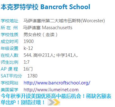 Bancroft School创建于1900年,占地30英亩,距今已有100多年的历史。该校招收幼儿园到12年级的学生,在教学中始终坚持学术与艺术自由。如今,学校有自超过56个国家和地区的575名学生。在过去的一个多世纪里,BancroftSchool目睹了许多变迁,但唯一不变的是把学生的需要作为教学工作的核心。学校现有学生575人,其中230人就读于高中部。学校共有教师124人,67%以上拥有高级学位。