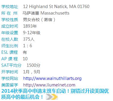 Walnut Hill School位于美国波士顿近郊,占地45英亩。它建立于1893年,是美国最古老的艺术高中之一,也是美国少数几个临近大都会的寄宿学校之一。胡桃山音乐学校为学生提供独特的艺术和学术训练。学生在术科方面可以在芭蕾、创意写作、音乐、戏剧与视觉艺术中选择一门主修;同时也必须参与严格的学科课程。