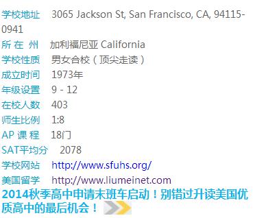 旧金山大学附属中学,创建于1973年,是一所私立走读混合学校,提供9-12年级的教育。San Francisco University High School在全美私立走读高中里属于顶尖级别,SAT平均分高达2078分。