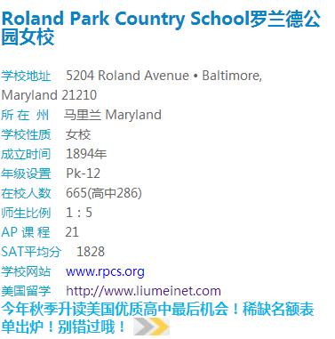 Roland Park Country School罗兰德公园女校是美国顶级郊区走读学校,出色的教育质量,有100多年历史,位于富人区,环境优美安全。学校设施一流,满足学生多样化活动。优秀师资,经常获得得各种奖项。100%学生升入四年制大学。距离美国首都华盛顿约一小时车程。校园面积:21英亩
