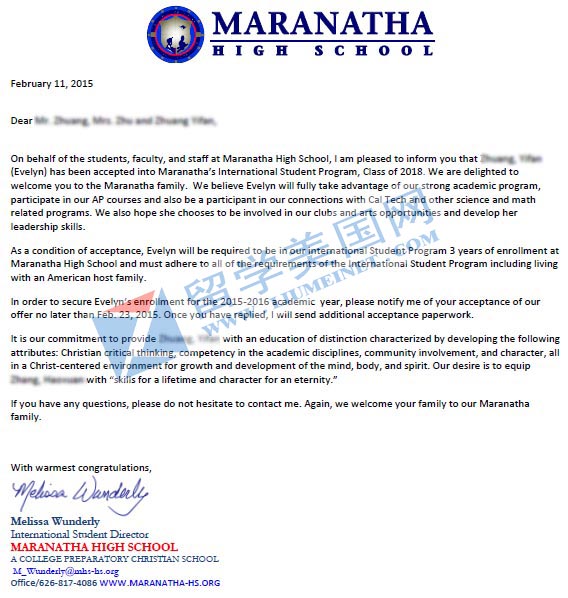 恭喜ZYF获加州马瑞娜瑟高中Maranatha High School 录取!