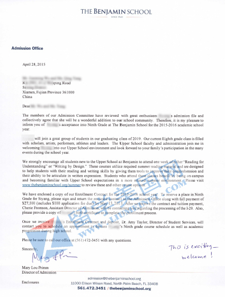 恭喜吴同学获佛罗里达本杰明中学录取!