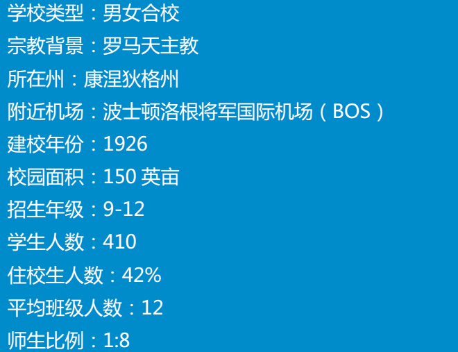 玛莉安中学是一所富有浓郁文化和读书氛围的学校,学校早在1955年便通过新英格兰地区学校联合会的认证。校园占地300英亩,环境优美,设施齐全。学生分别来自世界各地的20多个国家,校园中有15种以上的语言被使用。学校教育质量高,每个班级的平均学生 人数为15名,ESL 课程的班级人数为12名。Marianapolis Preparatory School位于康涅狄格州的Thompson,距离罗得岛州的 普罗维登斯和康涅狄格州Hartford只有 50 分钟,距离波士顿70分钟,纽约市3个小时,交通非常便捷,地理位置优越。