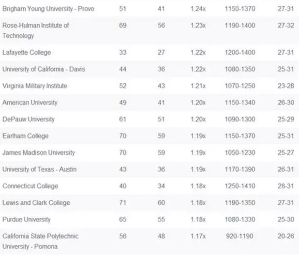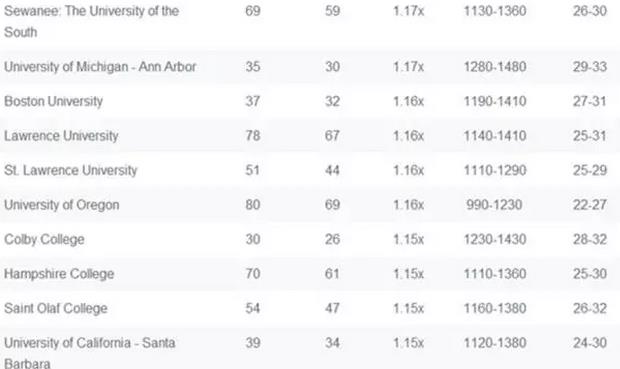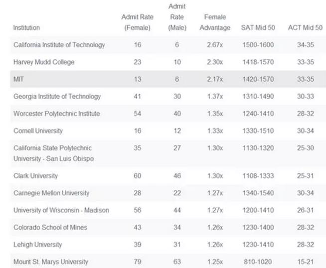 美国申请指导网站CollegeKickstart做了份很有意思的list——“女生申请更占优势的大学”一起来看看吧! “女生申请占明显优势的大学清单”上共有37所学校,毫无意外,基本上是所谓的STEM专业优势校,即science, technology, engineering and mathematics;不过,也包括像Boston University, American University, Clark University, Connecticut College and the University of Oregon等综合性大学。 数据包括了学校名称(Institution),Admit Rate(Female)女生录取率,Admit Rate(Male)男生录取率,Female Advantage(女生优势比), 还有SAT和ACT Mid 50(SAT/ACT中间50%的数据)。这里的SAT是计算Critical Reading 和 Math两部分。