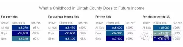上图从左到右依次显示了尤因塔县对贫穷,一般收入,高收入,富裕家庭的孩子的收入影响,基本都是正面影响,而且在全美范围内名列前茅。