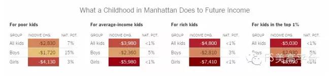 下图显示了,如果你在曼哈顿度过前20年,将会对你的年收入产生怎样的影响。可见无论对贫穷还是富裕家庭的孩子都只有负面影响。