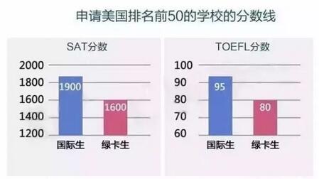 我们就以中国学生最自豪的考试成绩为例,同样录取一批次的学生,拥有绿卡的学生SAT平均只要求1600分,而国际学生(包括无绿卡的中国学生)却要求1800分,托福语言成绩的要求更是达到95分。个中差别,溢于言表。