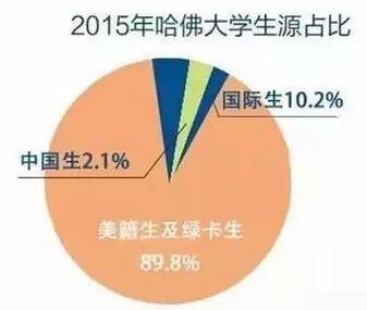 对比世界名校-哈佛大学2015年生源,我们能很直观看出,所录取的中国学生仅仅占到2.1%,是美籍生及绿卡生的1/43。大多数名校对国际生都有招生配额,而绿卡生完全不受配额的限制!