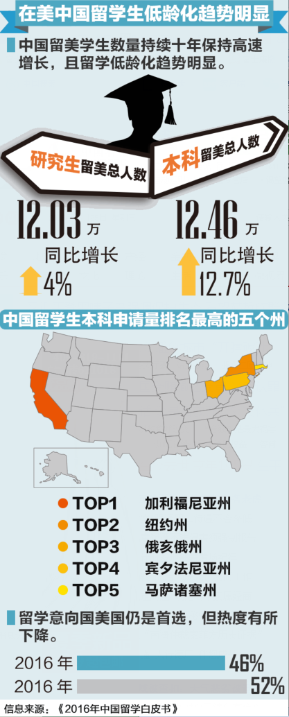而根据美国教育协会(IIE)发布的《开放报告2015》(Open Door Report 2015),从2007年到2015年,中国赴美国留学的人数每年保持两位数百分比增长,2014~2015学年也首次超过30万人,占全美国际学生总数的31.2%。而近年来中国学生赴美就读本科、研究生仍为大宗,本科留学生人数在去年首次超过研究生,但两者增速皆放缓。相比之下,选择就读高中的人数近10年来增长强劲。