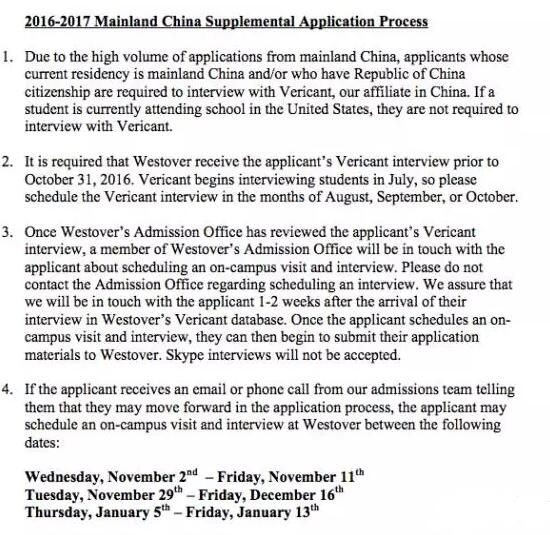 由于来自中国大陆的申请者过多,现在中国籍居住在中国大陆的学生申请必须通过维立克面试,如果学生已经在美国就读则可免维立克。