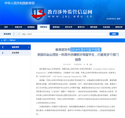 今天,教育部教育涉外监管信息网发布2016年第3号留学预警。预警称,美国旧金山湾区利佛山谷特许预科高中(Livermore Valley Charter Preparatory) 涉嫌欺诈我留学生,已被美多个部门调查。利佛山谷特许预科高中目前由当地一家教育公司“三谷学习公司”(ThI-Valley Learning Corporation)代管。