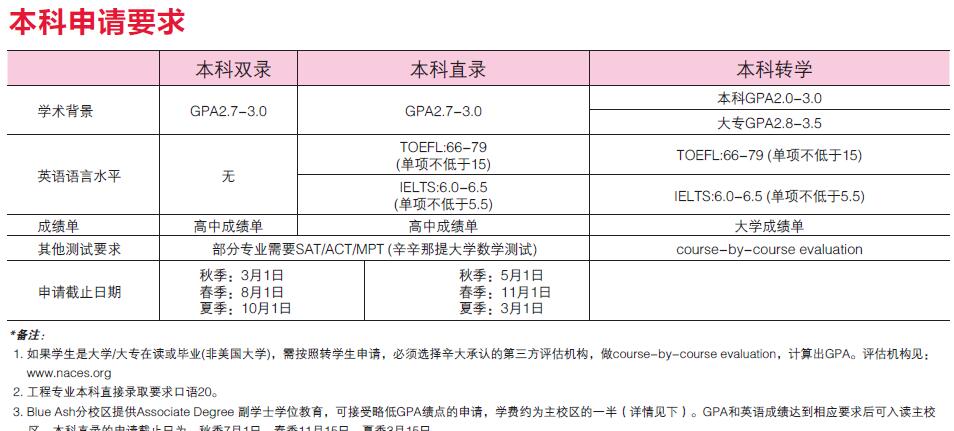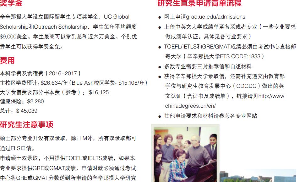 辛辛那提大学University of Cincinnati, 简称UC)始建于1819年,位于美国俄亥俄州辛辛那提市,是一所研究类综合性大学,也是全美第二早建立的公立大学。每年有约四亿五百万美金的研究经费,大学在科学、医药、商科、教育、工程以及艺术领域具有一流的教学和研究水平。辛辛那提大学被U.S. News & World Report评为全美一类大学,位列于全球前200位,同时被Nation Science Foundation评为Top 25的公立研究型大学。UC连续十年被普林斯顿评为全美最佳本科教育的大学之一,同时被评为投资回报率最佳的大学。大学下设13个学院:包括世界著名的建筑、设计、美术、规划学院(DAAP)、历史悠久且国际留学生最多的工程应用科学学院(CEAS)、及具竞争实力的商学院(LCB),和被誉为辛辛那提音乐之子的音乐学院(CCM)等。大学提供350多个专业,其中50个本科和研究生专业位列全美前50。著名的Co-op带薪实习项目起源于辛辛那提大学,16个国家的1500多家企业提供带薪实习机会,学习实践交替进行,成就了学生的高就业率。UC的注册在校生为44,251人,有400多个学生团体和组织。来自世界110多个国家的3,358名国际留学生构成了多元的校园文化氛围。近年,大学的国际留学生满意度全美排名第10(International Student Barometer)。