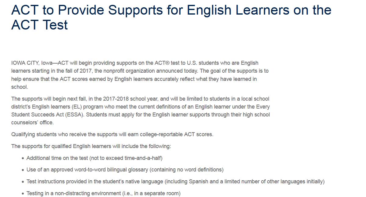 另,据ACT官方消息,自2017年秋季起,ACT将为符合条件的English Learner(即英语非母语的考生)提供考试时的辅助。ACT解释说此举是希望ACT考试能准确地反映学生真正在学校学到的知识的水平(不因为英语能力而影响到真实水平的发挥)。