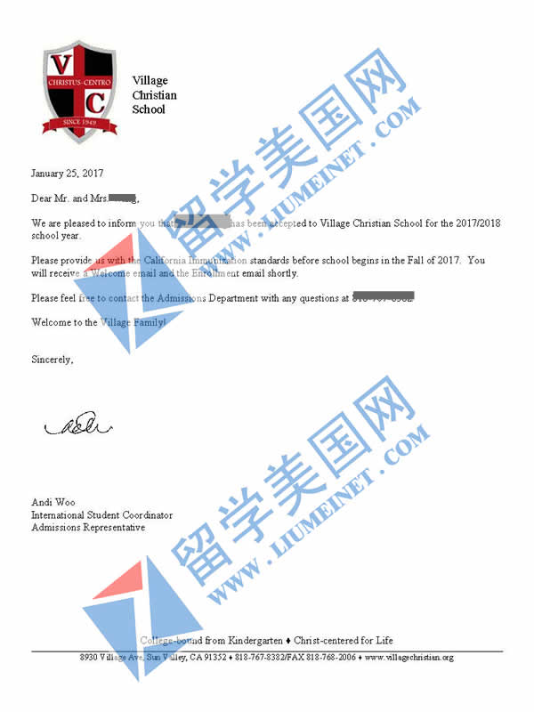 恭喜W同学获得维乐士中学 Village Christian School录取offer