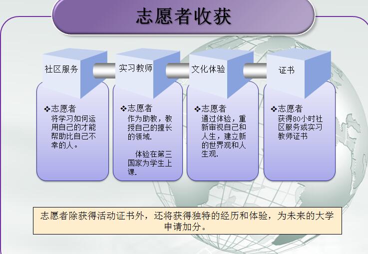 1,2周结束后,学生会得到100小时义工证明,表现优秀的学生还会有机会获得其他额外证书比如优秀团队合作等,更有机会得到校长英文推荐信。