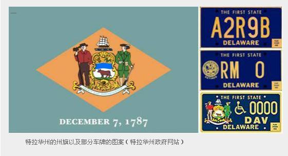 从首都华盛顿开车北上去纽约或费城,最快捷的是走95号州际高速公路,这样一定会经过特拉华州(Delaware)。只要一进特拉华州,所看到的当地汽车绝大多数都挂着深蓝底色的车牌,州名印在底下,顶上则是 “第一州”(THE FIRST STATE)三个字。