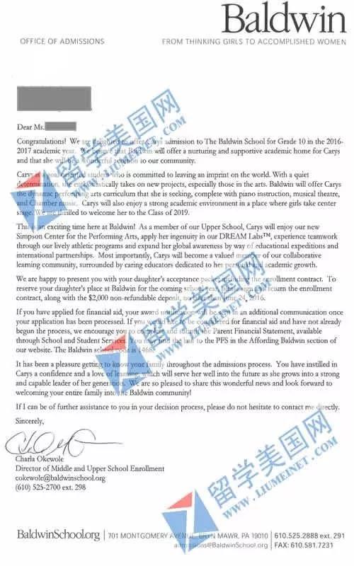 鲍德温学校The Baldwin School是一所贵族女子私立走读学校,坐落于美国东部宾州布林摩尔区,学校面积不大,学生人数也不多,但也有一百多年历史了,人文环境很好,老师们超级和善,学校很人性化,硬件设施小而精。这所学校教学质量很高,毕业生去常春藤盟校的比例去年达到20%,不少学生去了宾大的沃顿商学院。