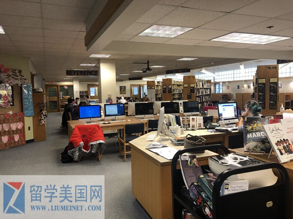 (Bancroft School图书馆藏书非常丰富,书架设计非常科学,保证每一个学生都能够拿到最上层的图书。先进的苹果电脑,便于每一位学生查阅资料)