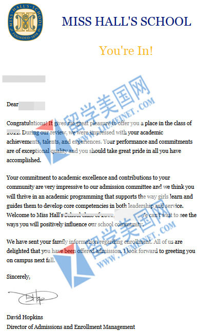 恭喜留美网F同学获得霍尔女子中学offer
