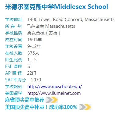 米德尔塞克斯中学Middlesex School学校建于1901年,是一所拥有百年历史的优秀私立高中,也是一所男女合校制的大学预备学校,该校位于马萨诸塞州的康科德。学校提供优质的教育,追求和谐、卓越。该校的特点是批判性思维,生动的教学和积极的氛围。100%的毕业生能进入一流大学继续深造。