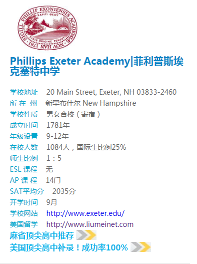 菲利普斯埃克塞特中学Phillips Exeter Academy是美国顶尖的寄宿中学,学校旁边就是商店,很便利,学校喜欢对知识有渴望的学生、擅长交流和积极的聆听学生,具有团队合作精神的学生、具有较好的组织管理和时间管理的学生、坚强的性格学生。石老师也考察过这所学校,新SAT均分1430,学校提供450多门课程设计19个学科领域,提供20种运动项目,110种课外社团活动,9种外文课程。升学率100%,升学走向非常棒,