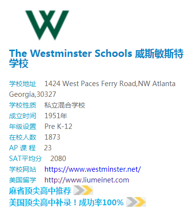 威斯敏斯特学院Westminster School该校是一所私立男女走读混校,SAT平均分1802;学校占地34英亩,校园环境美丽,被誉为“公园式校园”,设施完备齐全!学校辩论队实力非常雄厚,学校是全国演讲和辩论联盟成员,有很多辩论比赛机会,近14年来,学校辩论队获得过308次奖励!该校74%的学生至少参加了一项运动。学校运动队成绩突出,在足球、越野、游泳、网球项目上都曾获得过州冠军。升学率100%,升学走向超棒!2015年50余名毕业生共获得168万美元奖学金。