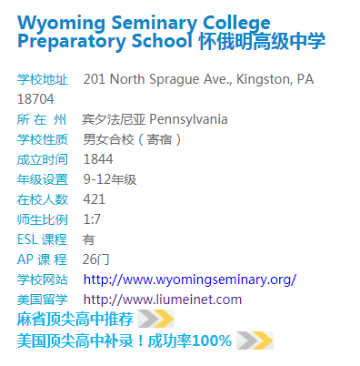 怀俄明高中Wyoming Seminary建于1844年,是美国著名的百年贵族名校,也是美国东北部最古老的中学及大学预科学校。学校注重教学质量,自创建以来一直以“教学严谨、管理严格”著称,55%的毕业生考取并就读于美国著名大学。完成学业的同时,学生可通过学校活泼的教学,了解及欣赏艺术、音乐、科学及文学,让学生学会独立自主、有责任心、学会合作、互相照顾、关心世界及尊重他人。学校位于宾西法尼亚州的东北部,是一个男女合校兼有走读和寄宿的大学预科学校。在这里,学生和老师勇于挑战自我的对方,来实现学术和人生目标。
