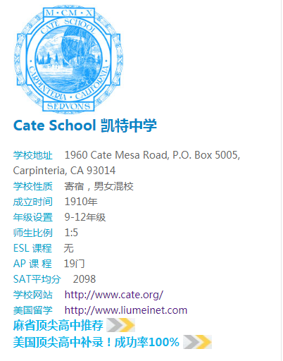 凯特中学创办于1910年,是美国悠久传统的男女合校中学之一,也是一所大学预备寄宿学校。2001年5月,被美国时报和世界新闻称之为最着名的寄宿学校。学校校风良好,教学品质高,具有严格的教学标准,并且很多的机会让学生开展自己感兴趣的课程。学校为学生提供了很多参与社会的机会,让他们帮助那些需要帮助的人。凯特中学位于加州的圣巴巴拉县,距离太平洋只有一英里。Cate School坐落在山顶上,离海滩只有5分钟,从学校的校园可以远眺美丽的太平洋。